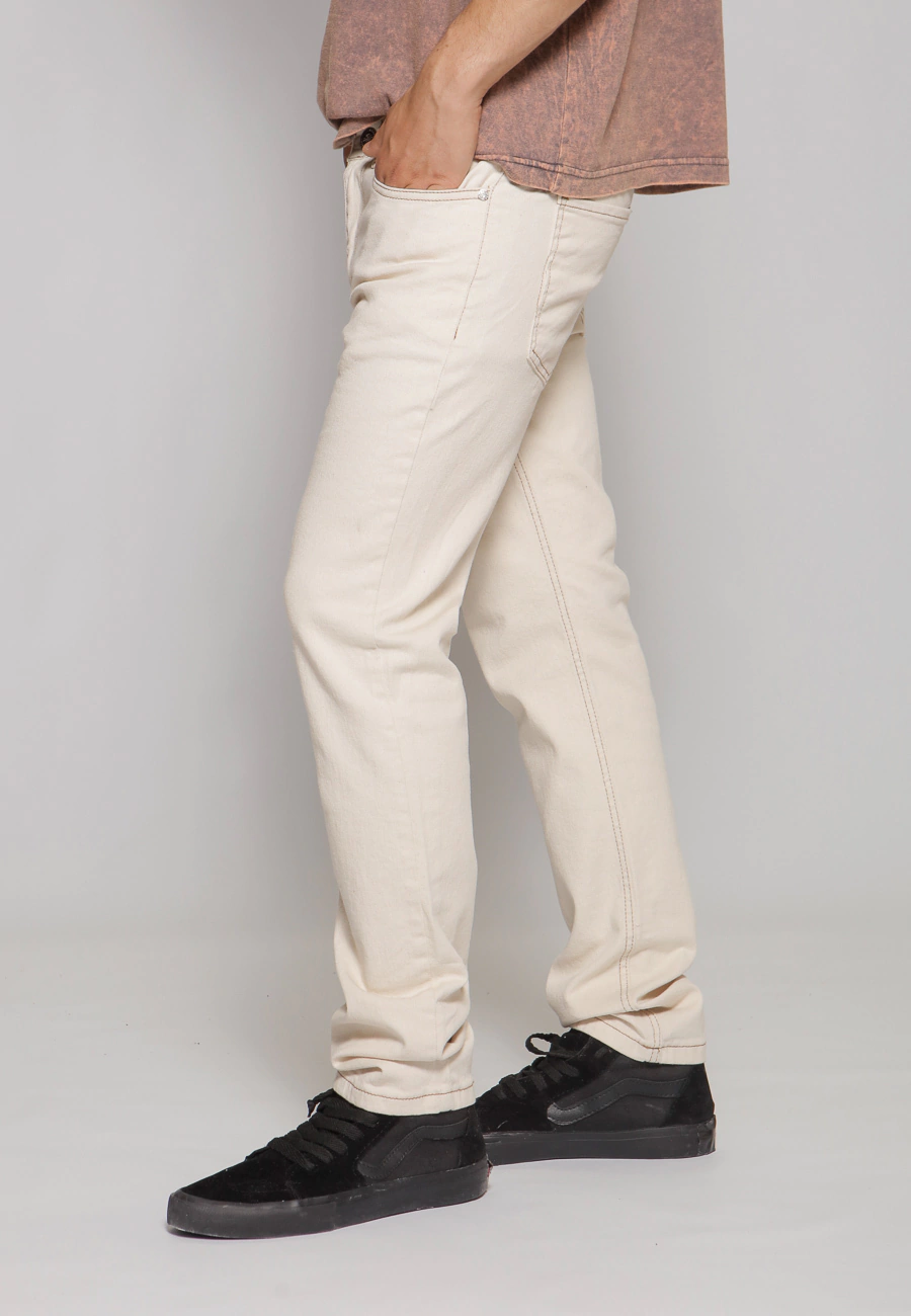 Jean Sand con calce regular, confeccionado en denim 100% algodón. Su tono off white y su estructura firme le dan un estilo limpio y versátil, ideal para combinar con remeras o camisas en looks urbanos o más clásicos.