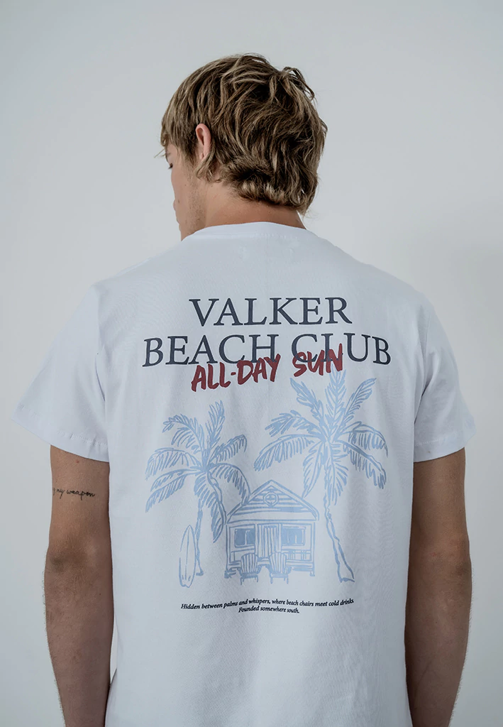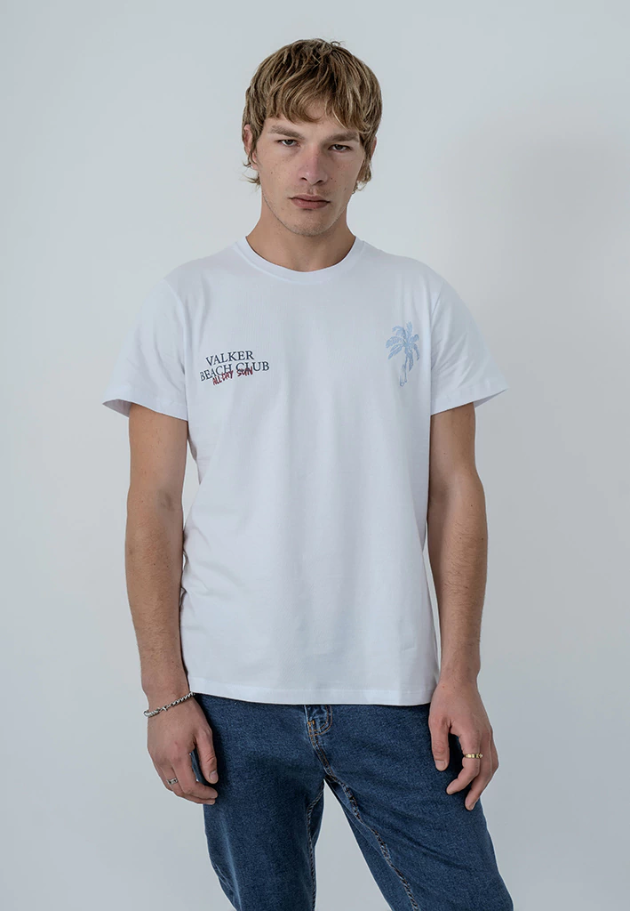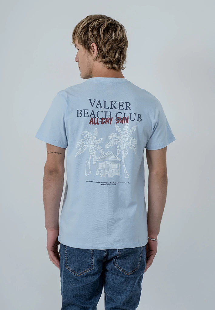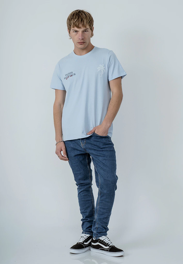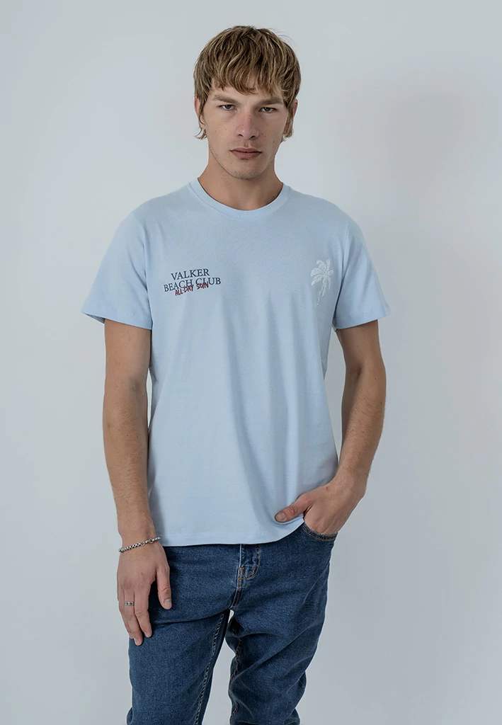 Remera Beack Club de algodón liviano en tono celeste claro, con calce regular y cuello redondo. Lleva estampado en el frente con el texto “Valker Beach Club” y una pequeña palmera bordada, que aportan un toque veraniego y relajado. Ideal para looks casuales o de playa, combinando con jeans o bermudas.
