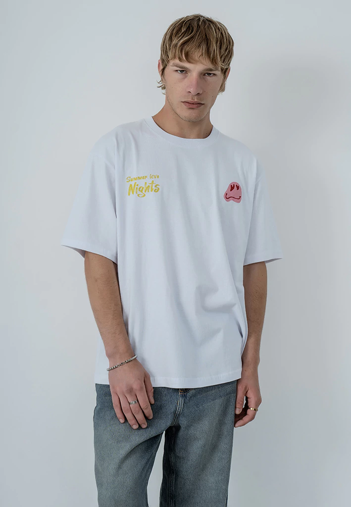 Remera Love Night una prenda confeccionada en algodón suave, presenta un diseño over con cuello redondo y mangas cortas, ideal para un look relajado y moderno. Destaca por su estampa exclusiva adelante y atrás, que le aporta un toque distintivo y urbano.
